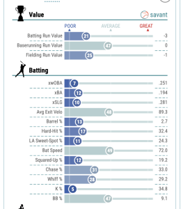 But before you say “recession is coming”, there are some not-so-good signs where a full energy recovery is going. He only has 4.8% PulledAir. Yes, that would be a small sampling of the quirk, but those barrels go in the opposite direction so far, and it’s tough to homer that way. Also, his LA is down to 7.0, so it’s hard contact on the ground. That should help Avg. his, and when he looks unlucky as he has a .253 Avg vs. .286 x BA. He steals 6 times, so he’s on his way to 30 if he stays healthy.