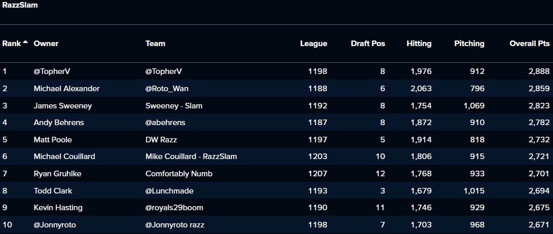 Each week we’ll also look at the top ten standings in our other Razzball sponsored league, RazzSlam. This is our NFBC Best Ball league with managers from across the industry, from content providers to fans and readers like you.